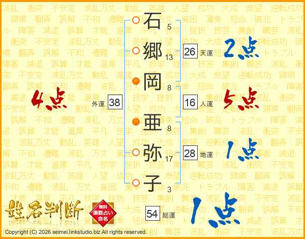 石郷岡亜弥子さんの外運は38画の4点!