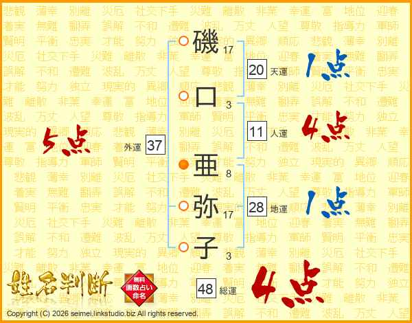 磯(17画)口(3画) 亜(8画)弥(17画)子(3画)