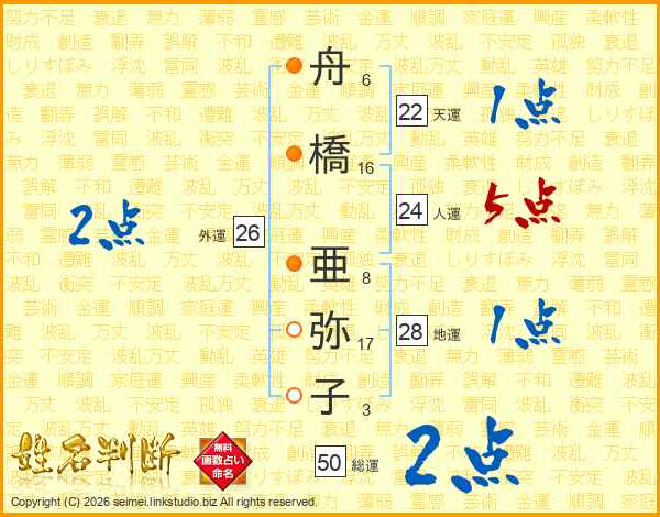 舟(6画)橋(16画) 亜(8画)弥(17画)子(3画)
