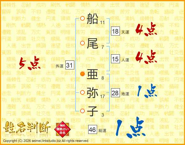 船(11画)尾(7画) 亜(8画)弥(17画)子(3画)