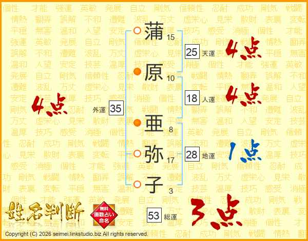蒲(15画)原(10画) 亜(8画)弥(17画)子(3画)