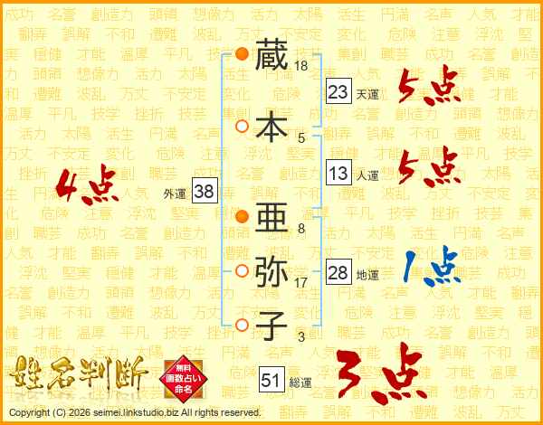 蔵(18画)本(5画) 亜(8画)弥(17画)子(3画)