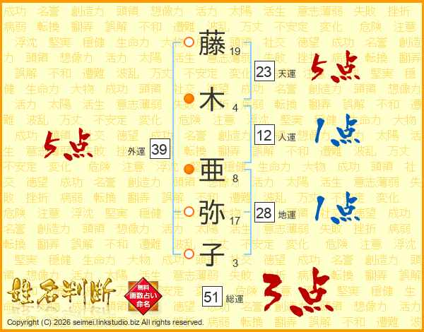 藤(19画)木(4画) 亜(8画)弥(17画)子(3画)