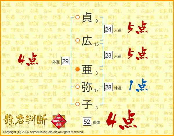 貞(9画)広(15画) 亜(8画)弥(17画)子(3画)