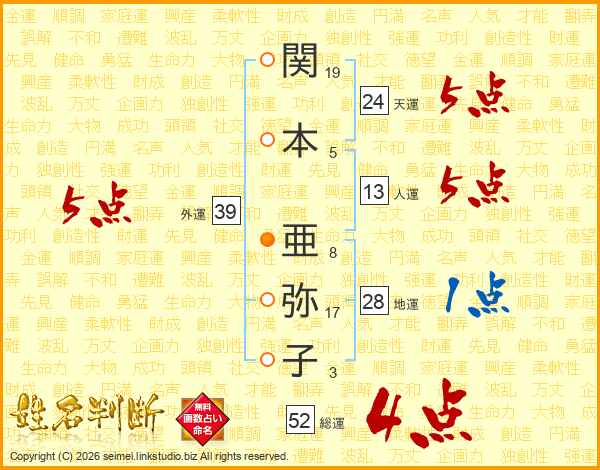 関(19画)本(5画) 亜(8画)弥(17画)子(3画)