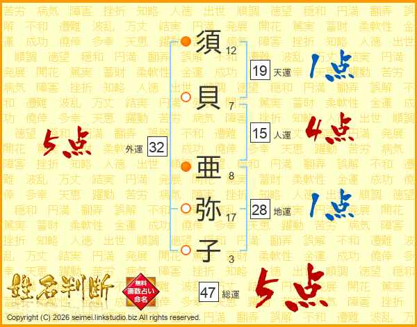 須(12画)貝(7画) 亜(8画)弥(17画)子(3画)