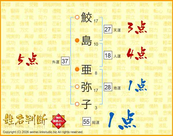 鮫(17画)島(10画) 亜(8画)弥(17画)子(3画)