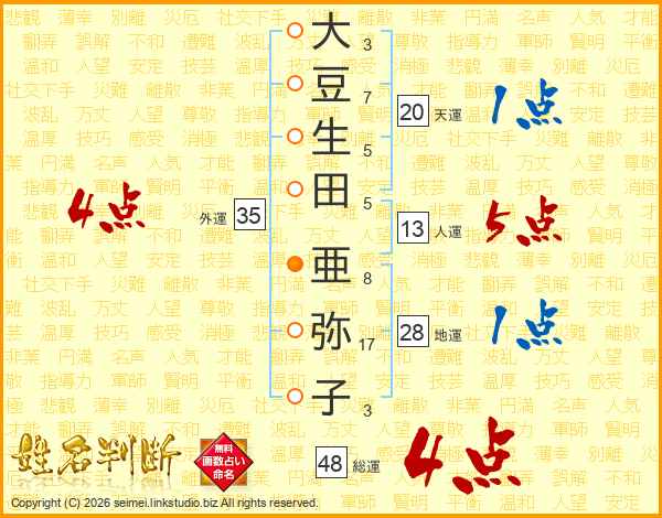 大(3画)豆(7画)生(5画)田(5画) 亜(8画)弥(17画)子(3画)