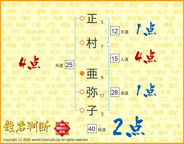 正(5画)村(7画) 亜(8画)弥(17画)子(3画)