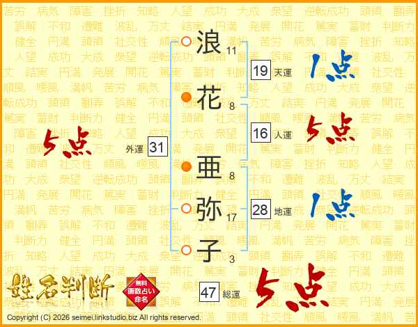 浪(11画)花(8画) 亜(8画)弥(17画)子(3画)