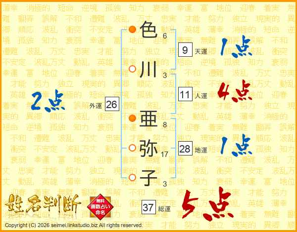 色(6画)川(3画) 亜(8画)弥(17画)子(3画)