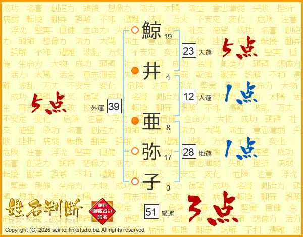 鯨(19画)井(4画) 亜(8画)弥(17画)子(3画)