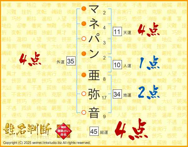 マ(2画)ネ(4画)パ(3画)ン(2画) 亜(8画)弥(17画)音(9画)