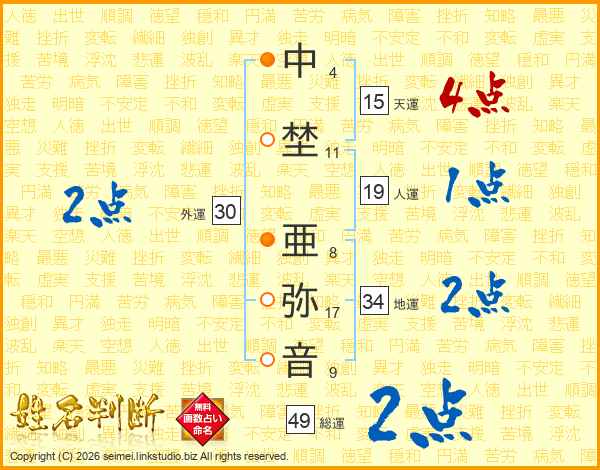 中埜亜弥音さんの総運は49画の2点!