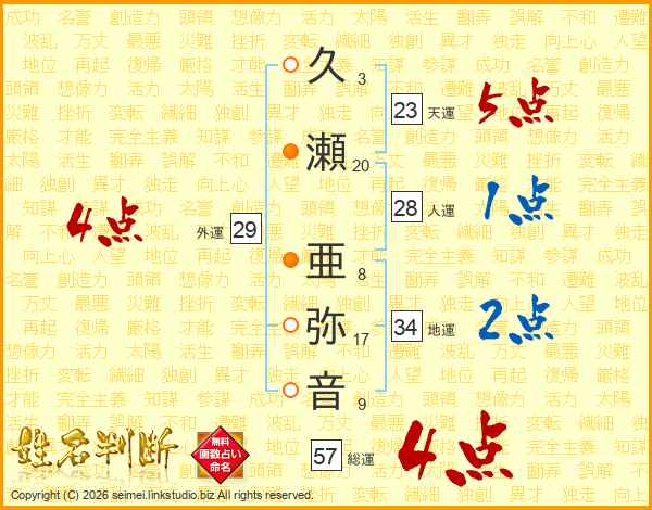 久瀬亜弥音さんの総運は57画の4点!