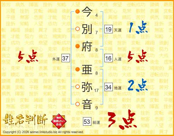 今(4画)別(7画)府(8画) 亜(8画)弥(17画)音(9画)