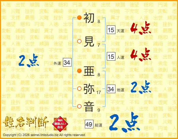 初(8画)見(7画) 亜(8画)弥(17画)音(9画)