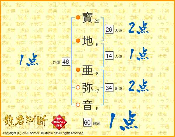 寳(20画)地(6画) 亜(8画)弥(17画)音(9画)