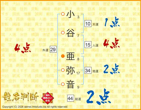小谷亜弥音さんの総運は44画の2点!