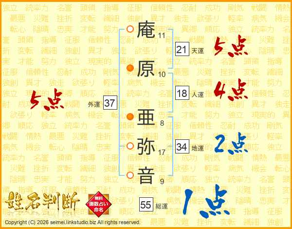 庵(11画)原(10画) 亜(8画)弥(17画)音(9画)