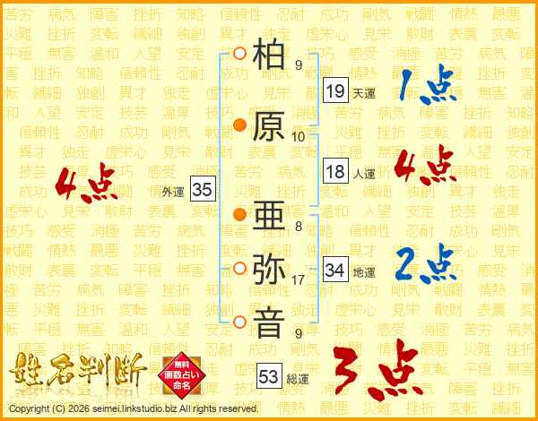 柏原亜弥音さんの総運は53画の3点!