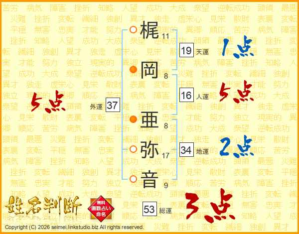 梶(11画)岡(8画) 亜(8画)弥(17画)音(9画)