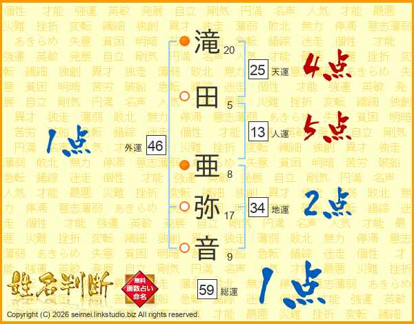 滝(20画)田(5画) 亜(8画)弥(17画)音(9画)