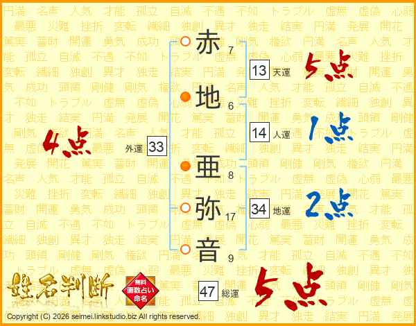 赤地亜弥音さんの総運は47画の5点!