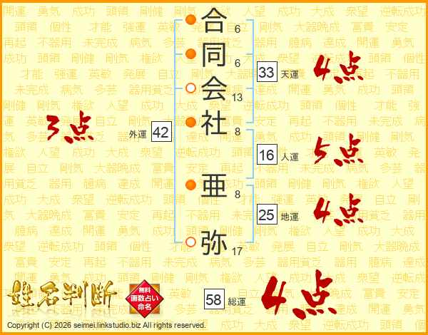 合(6画)同(6画)会(13画)社(8画) 亜(8画)弥(17画)