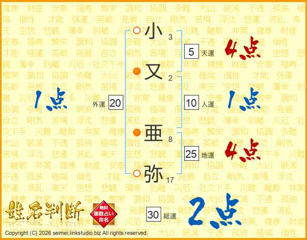 生活面を象徴する運勢です。外部から受ける影響力を表し、結婚運、家庭運や職場、環境への順応性を表します。総運から人運を引いた画数。姓や名が1文字の場合を除く。