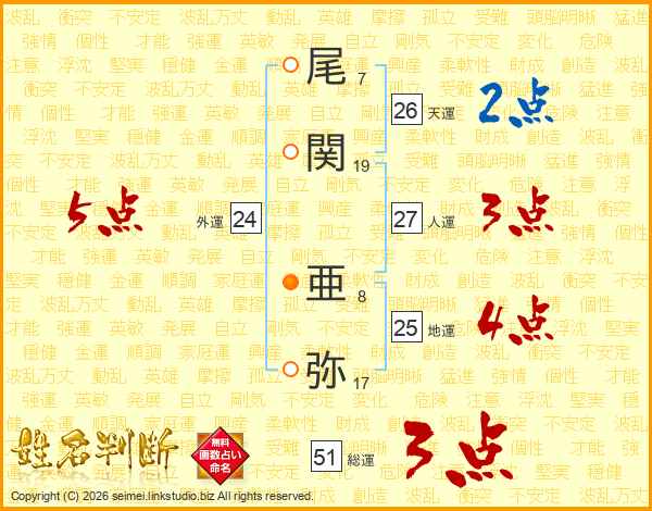 尾(7画)関(19画) 亜(8画)弥(17画)