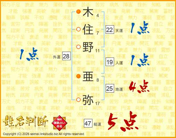 木(4画)住(7画)野(11画) 亜(8画)弥(17画)