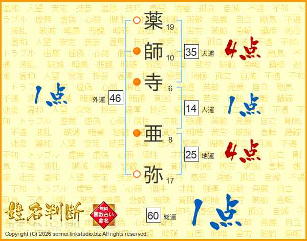 薬(19画)師(10画)寺(6画) 亜(8画)弥(17画)