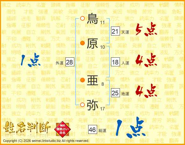 鳥(11画)原(10画) 亜(8画)弥(17画)