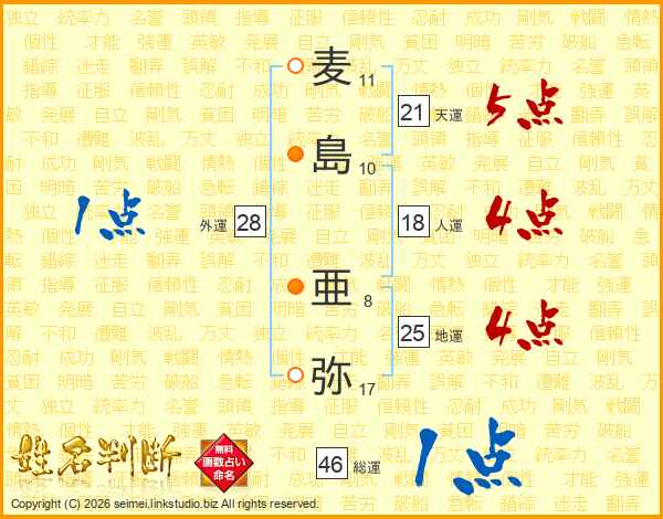 麦(11画)島(10画) 亜(8画)弥(17画)