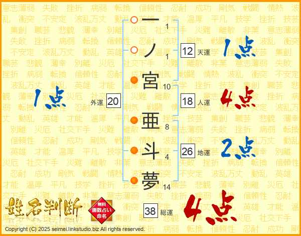 一ノ宮亜斗夢さんの総運は38画の4点!