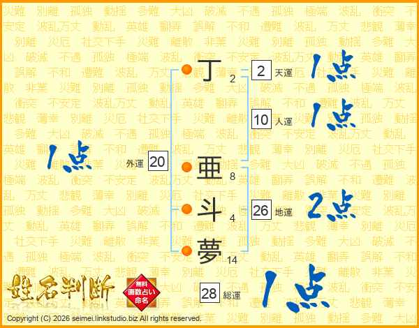 丁(2画) 亜(8画)斗(4画)夢(14画)