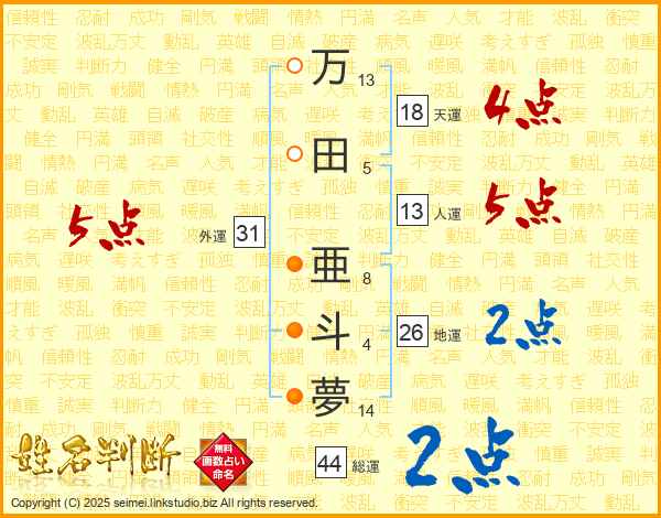 万田亜斗夢さんの総運は44画の2点!
