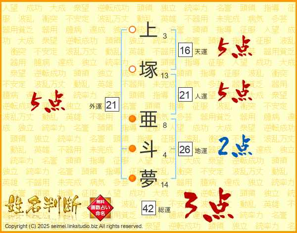 上(3画)塚(13画) 亜(8画)斗(4画)夢(14画)