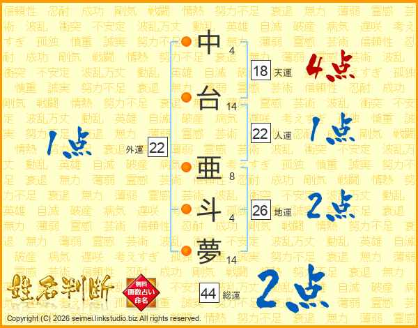 中台亜斗夢さんの総運は44画の2点!