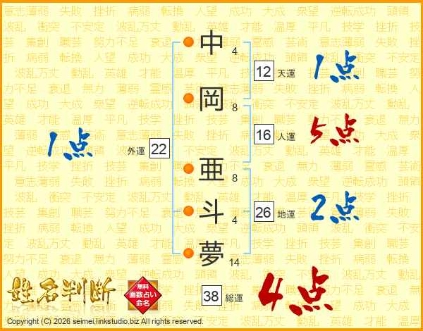 中岡亜斗夢さんの総運は38画の4点!