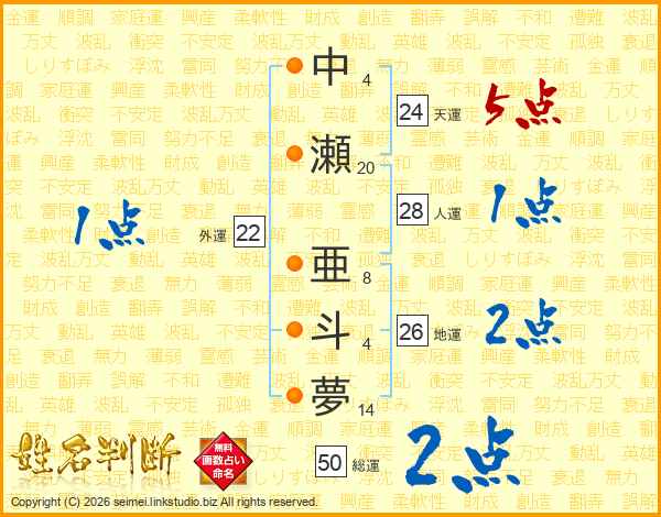 中(4画)瀬(20画) 亜(8画)斗(4画)夢(14画)