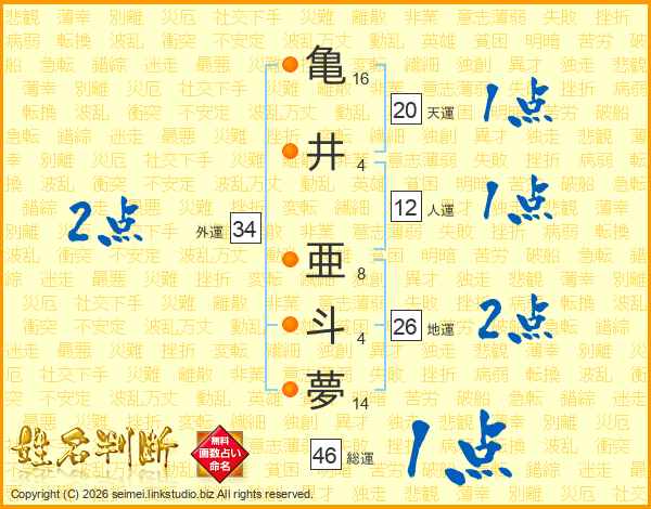 亀(16画)井(4画) 亜(8画)斗(4画)夢(14画)