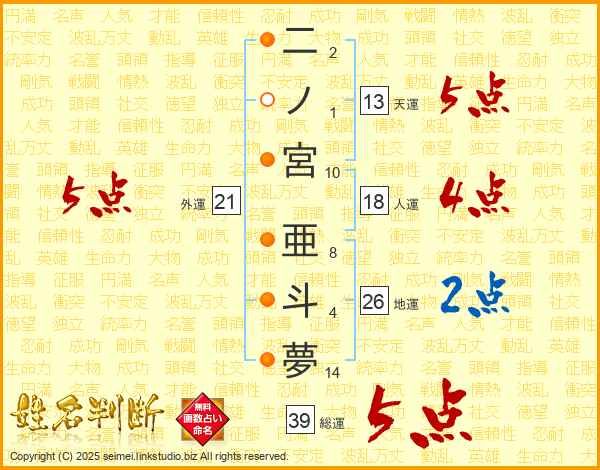 二ノ宮亜斗夢さんの総運は39画の5点!