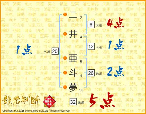 生活面を象徴する運勢です。外部から受ける影響力を表し、結婚運、家庭運や職場、環境への順応性を表します。総運から人運を引いた画数。姓や名が1文字の場合を除く。