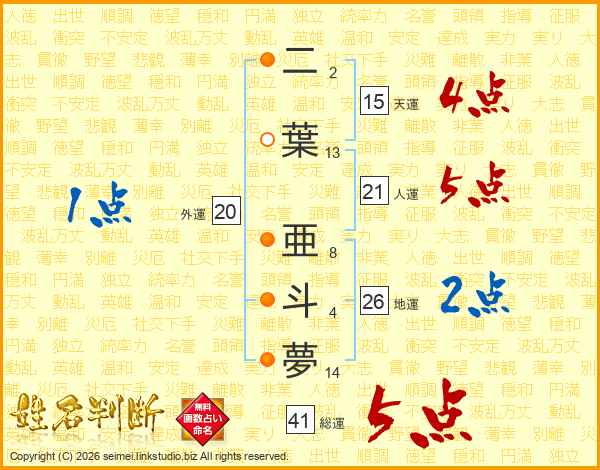 二葉亜斗夢さんの総運は41画の5点!