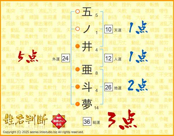 五(5画)ノ(1画)井(4画) 亜(8画)斗(4画)夢(14画)
