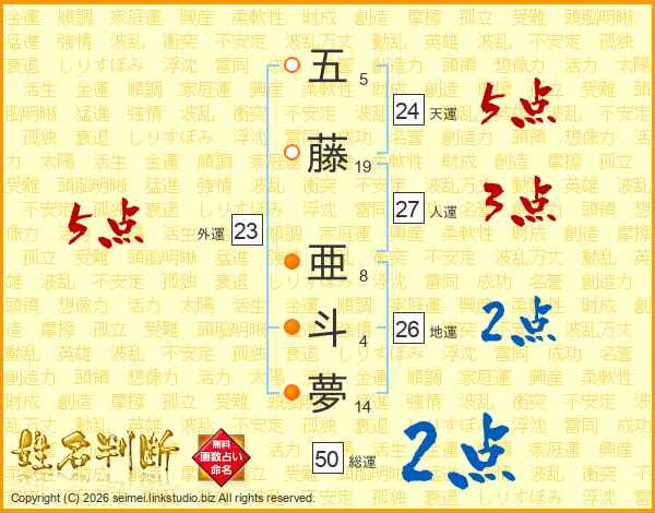 五(5画)藤(19画) 亜(8画)斗(4画)夢(14画)