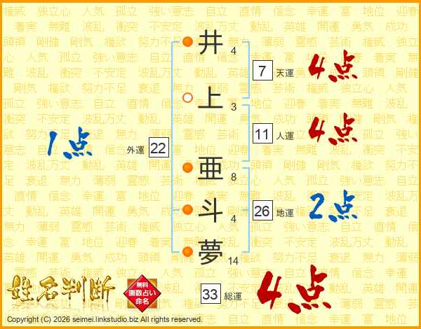 井(4画)上(3画) 亜(8画)斗(4画)夢(14画)