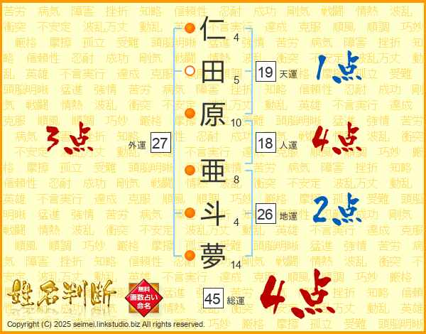 仁(4画)田(5画)原(10画) 亜(8画)斗(4画)夢(14画)